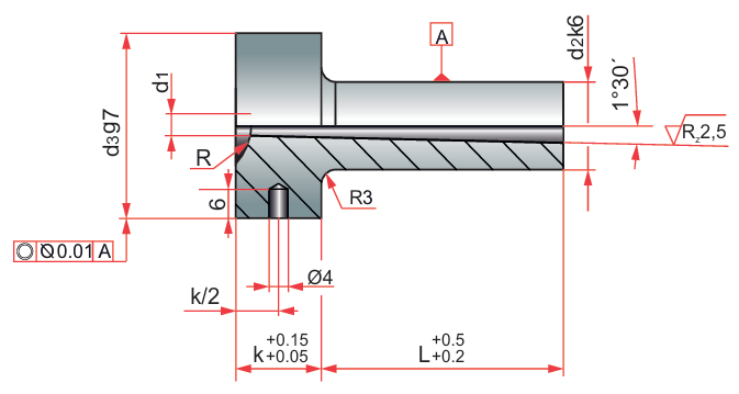 Bucha de Injeção em material DIN 1.2826 (ou similar) com dureza de 55 HRC, diâmetro de entrada de mínimo 3,5 mm, dimensão variada de raio de acoplamento e ângulo de canal de fluxo, comprimento para montagem em placa de 22 a 96 mm, diâmetro de ajuste na placa cavidade “k6” e no anel de centragem “g7”.