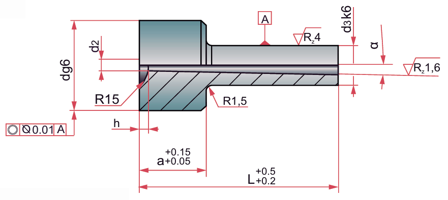 Bucha de Injeção com dureza de 58-60 HRC, diâmetro de entrada de 4 mm, comprimentos de 70 até 100mm, ângulo de 1º e 2º, raio esférico de acoplamento de 15 mm, diâmetro de ajuste na placa cavidade “k6” e no anel de centragem “g6”.