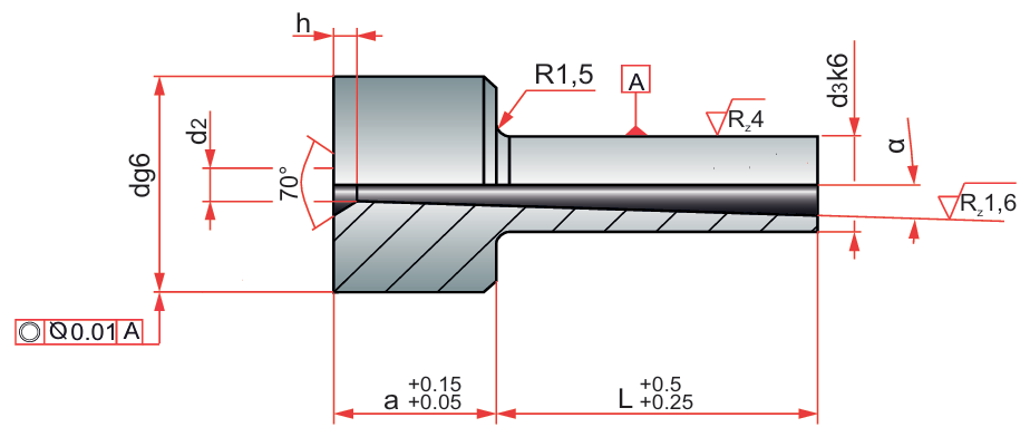 Bucha de Injeção com dureza de 21-23 HRC, diâmetro de entrada de 5 mm, comprimento de 27 até 116 mm, ângulo de 1º, ângulo de acoplamento de 70º, diâmetro de ajuste na placa cavidade “k6” e no anel de centragem “g6”.