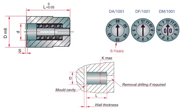 Datador de corpo longo utilizado para rastreabilidade, possui dados do tipo mês, ano, ou ambos. Dimensões mínimas de 4mm e máxima de 16mm, com comprimento mínimo de 5mm e máximo de 14mm.