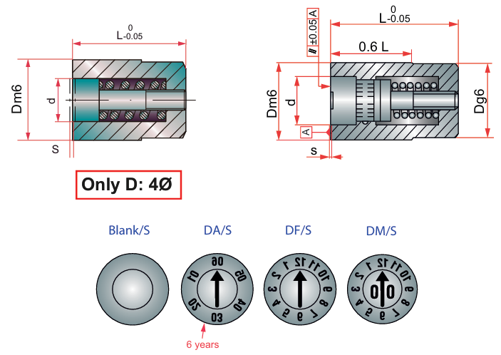 Datador de corpo curto utilizado para rastreabilidade, possui dados do tipo mês, ano, ou ambos. Dimensões mínimas de 4mm e máxima de 20mm, com comprimento mínimo de 5mm e máximo de 20mm. Seu posicionamento é feito por um inserto que contém esfera e o corpo possui “pontos” de paradas específicas e precisas.