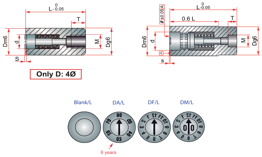 Datador de corpo longo utilizado para rastreabilidade, possui dados do tipo mês, ano, ou ambos. Dimensões mínimas de 4mm e máxima de 12mm, com comprimento mínimo de 12mm e máximo de 20mm. Seu posicionamento é feito por um inserto que contém esfera e o corpo possui “pontos” de paradas específicas e precisas.