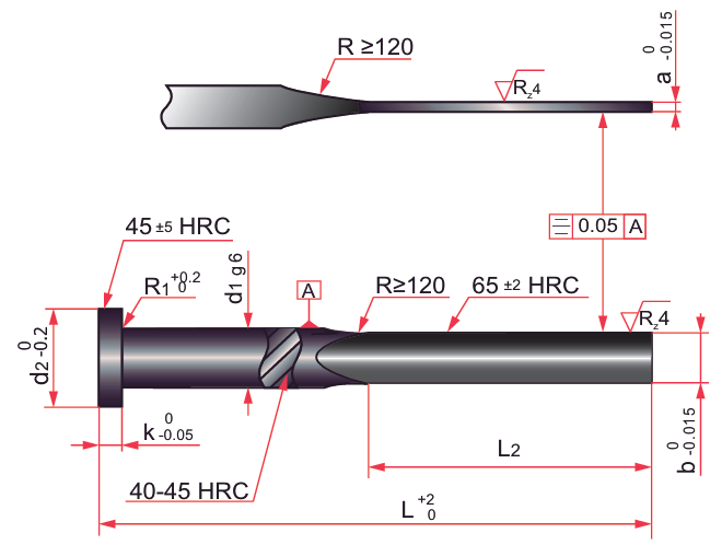 Extratores em aço H13 ou DIN 1.2344, nitretado, com acabamento superficial revestido de bissulfeto de molibdênio (MoS2), tolerância e geometria conforme a norma mundial DIN 1530. Dimensões de lâmina de 0,8×3,5mm até 2,5×15,5mm e comprimento de até 400mm. Dureza superficial de 950 HV e dureza interna de 40-45 HRC.