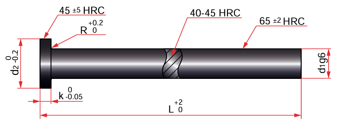 Extratores em aço H13 ou DIN 1.2344, nitretado, com acabamento superficial revestido de bissulfeto de molibdênio (MoS2), tolerâncias e geometria conforme a norma mundial DIN 1530. Dimensões de diâmetro de 1mm até 32mm e comprimento ate 1000mm. Dureza superficial de 950 HV e dureza interna de 40-45 HRC.