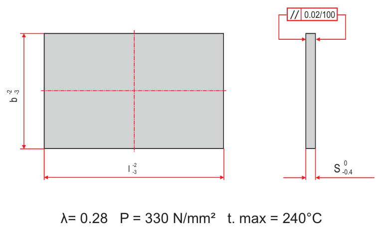 Disponível em tamanhos das placas de moldes padronizados, espessuras de 6mm e 8mm para os moldes maiores. Sua composição com material rígido permite que seja efetuado usinagens, cortes, sem danificar a placa. Paralelismo de 0,02 a cada 100mm.