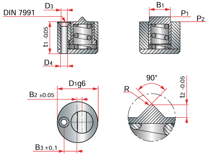 Um elemento de travamento eficiente, com força de retenção de até 9 kilos (BR5130-27), sua mola permite trabalho em ambiente de até 100º C e material 1.2842 tratado com dureza de 58-60 HRC.