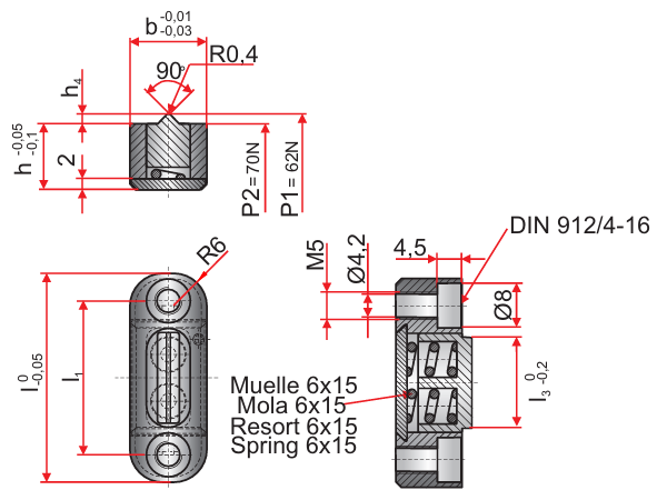 Posicionadores com ação prismática, material aço 1.2343 e dureza de 52-54. Possui força de retenção variável de 6 até 22 kilos, temperatura de trabalho de 100º C.